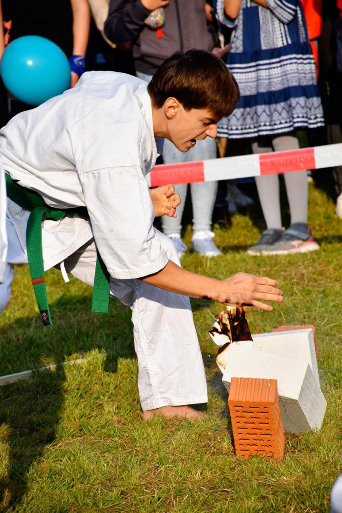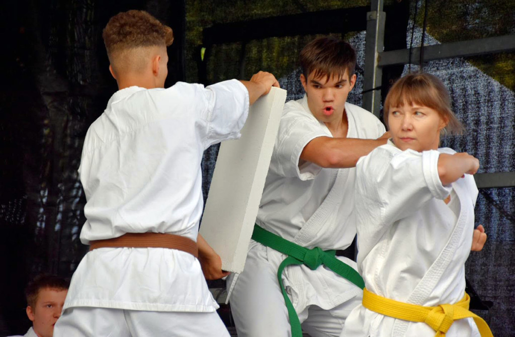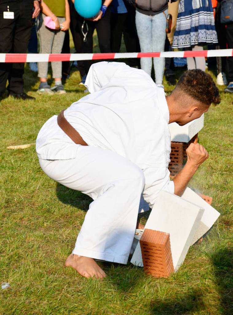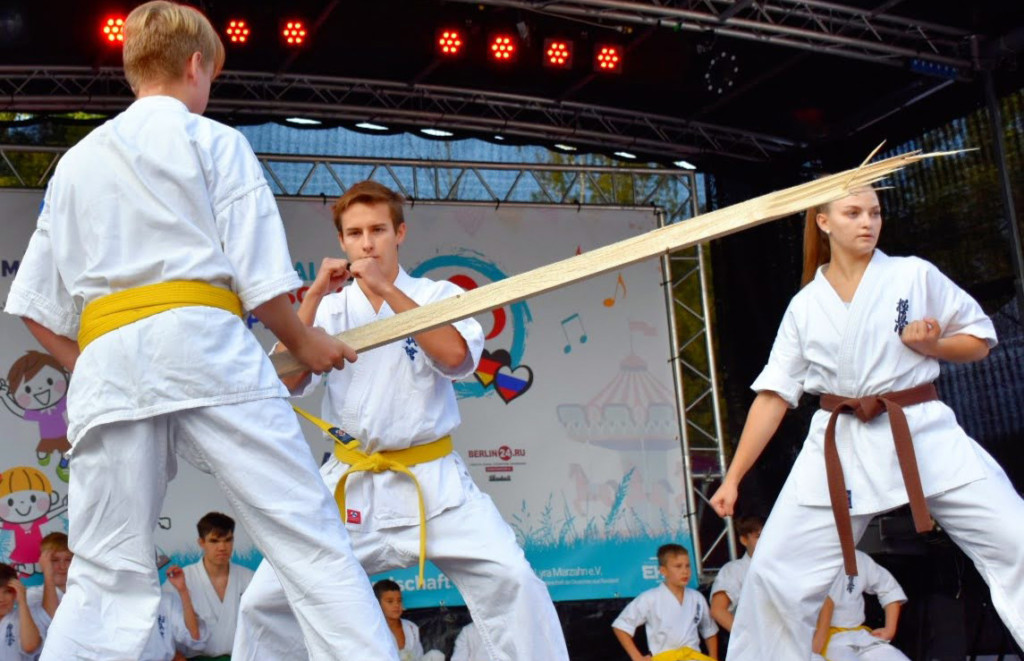 А вот ката наши ребята продемонстрировали как в лучшие времена, разбавляя их тамэсивари – ломали доски, палки, блоки… Старшие же ученики выполнили ката “Сэйенчин” в зеркальном отражении друг друга и, спрыгнув со сцены, сломали толстые и горящие блоки всеми основными четырьмя частями ударными зонами – кентас,  какато, хидзи и шуто. Разбили все!