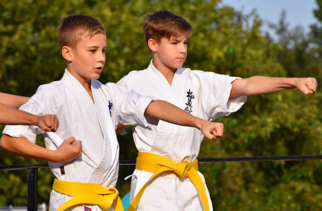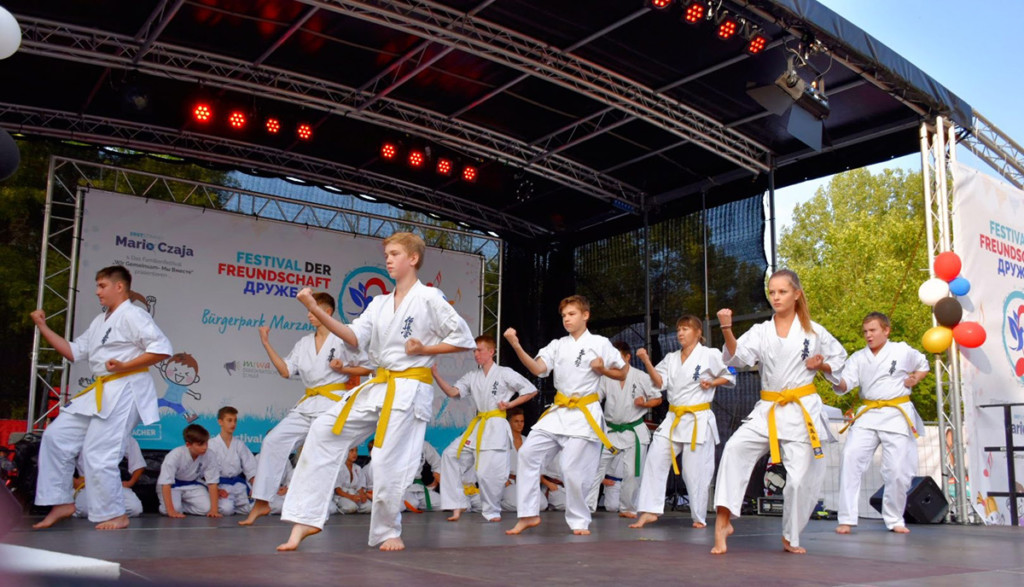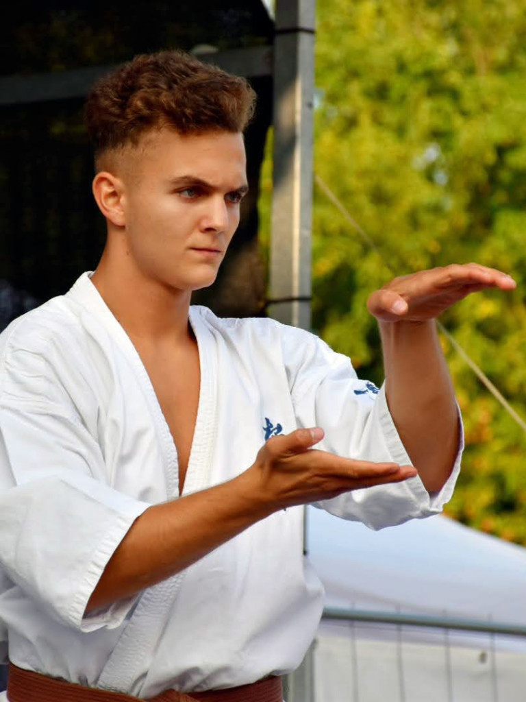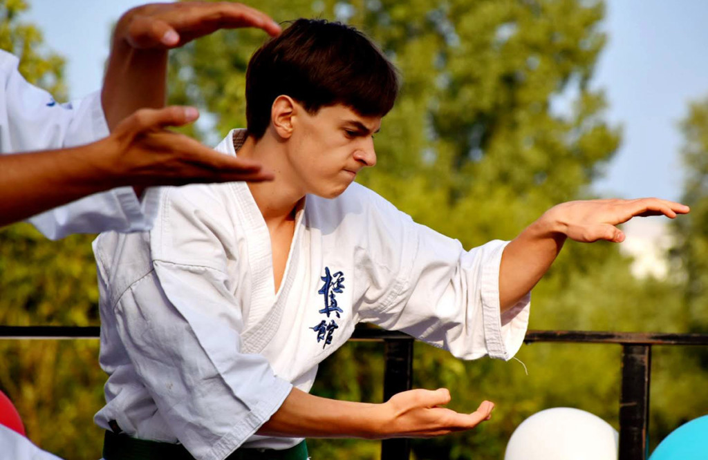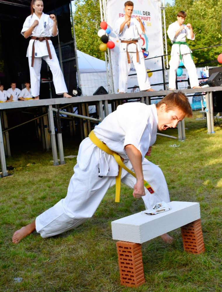 А вот ката наши ребята продемонстрировали как в лучшие времена, разбавляя их тамэсивари – ломали доски, палки, блоки… Старшие же ученики выполнили ката “Сэйенчин” в зеркальном отражении друг друга и, спрыгнув со сцены, сломали толстые и горящие блоки всеми основными четырьмя частями ударными зонами – кентас,  какато, хидзи и шуто. Разбили все!